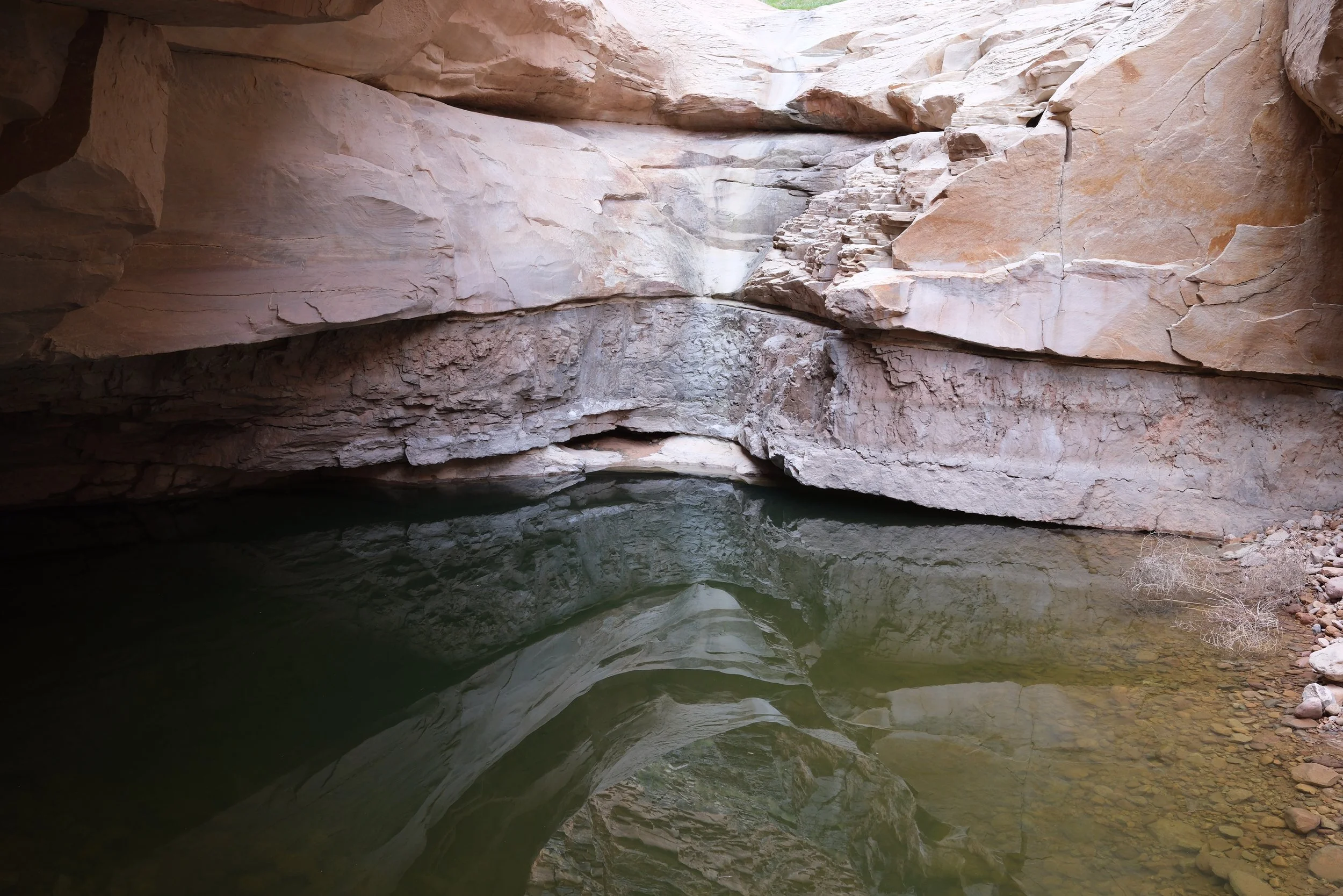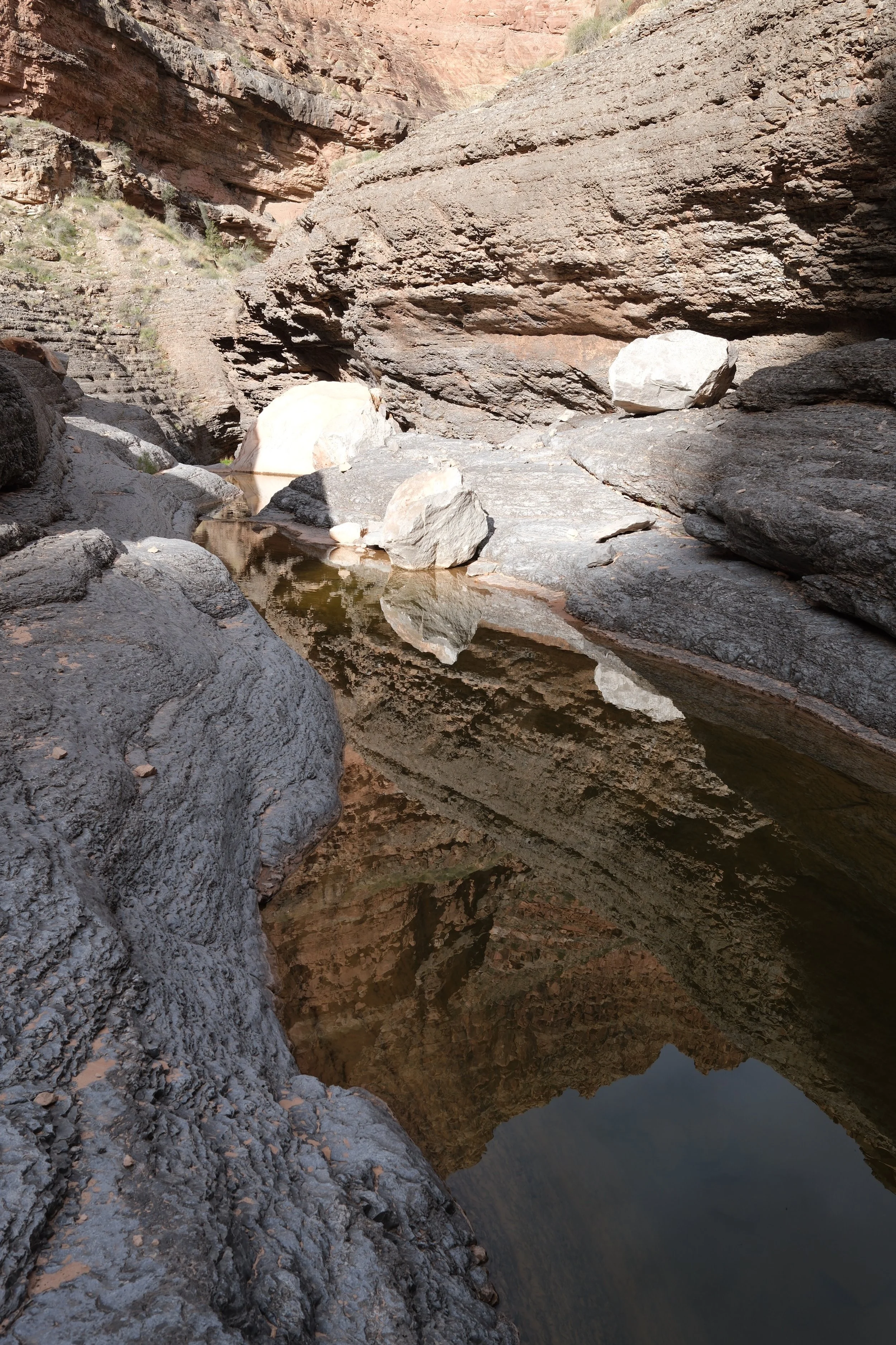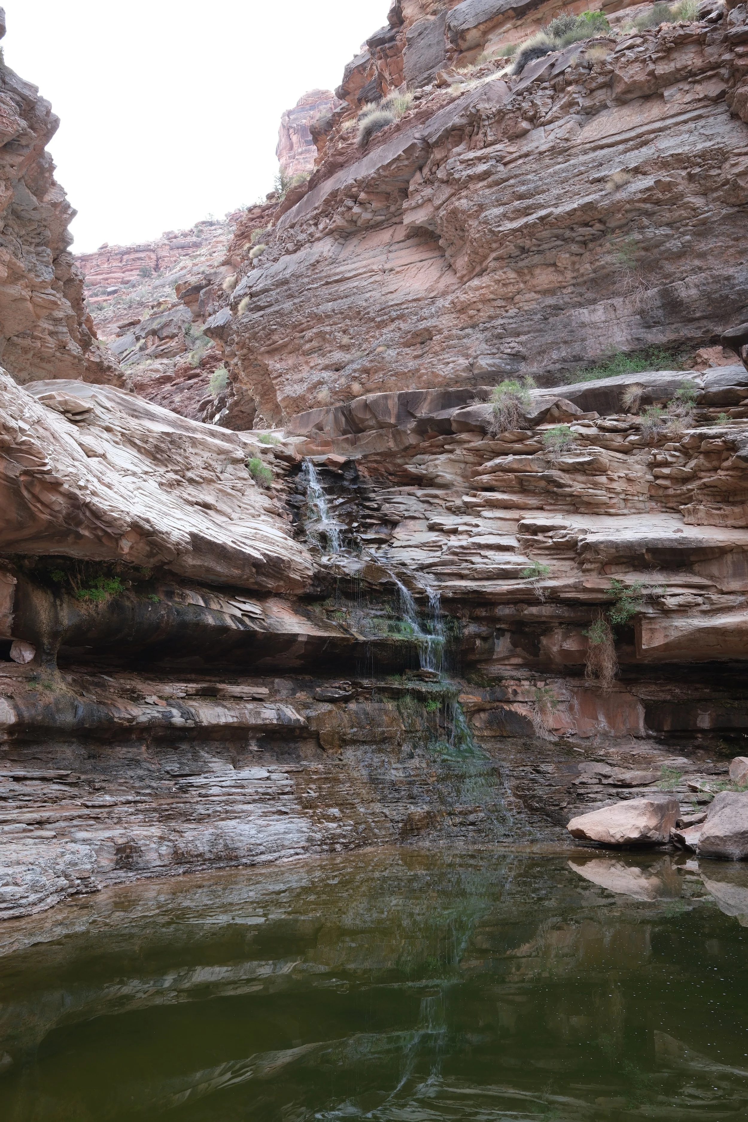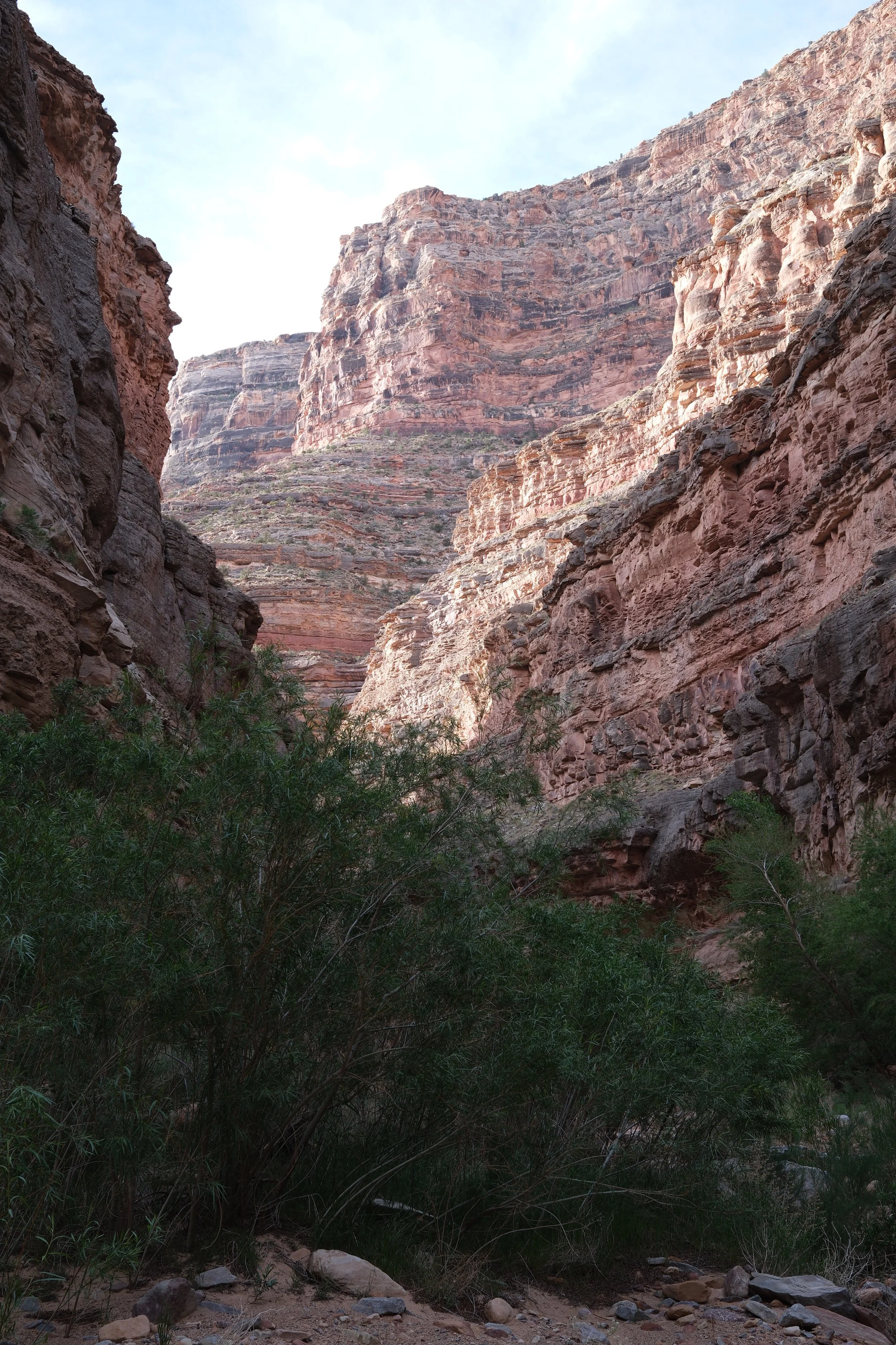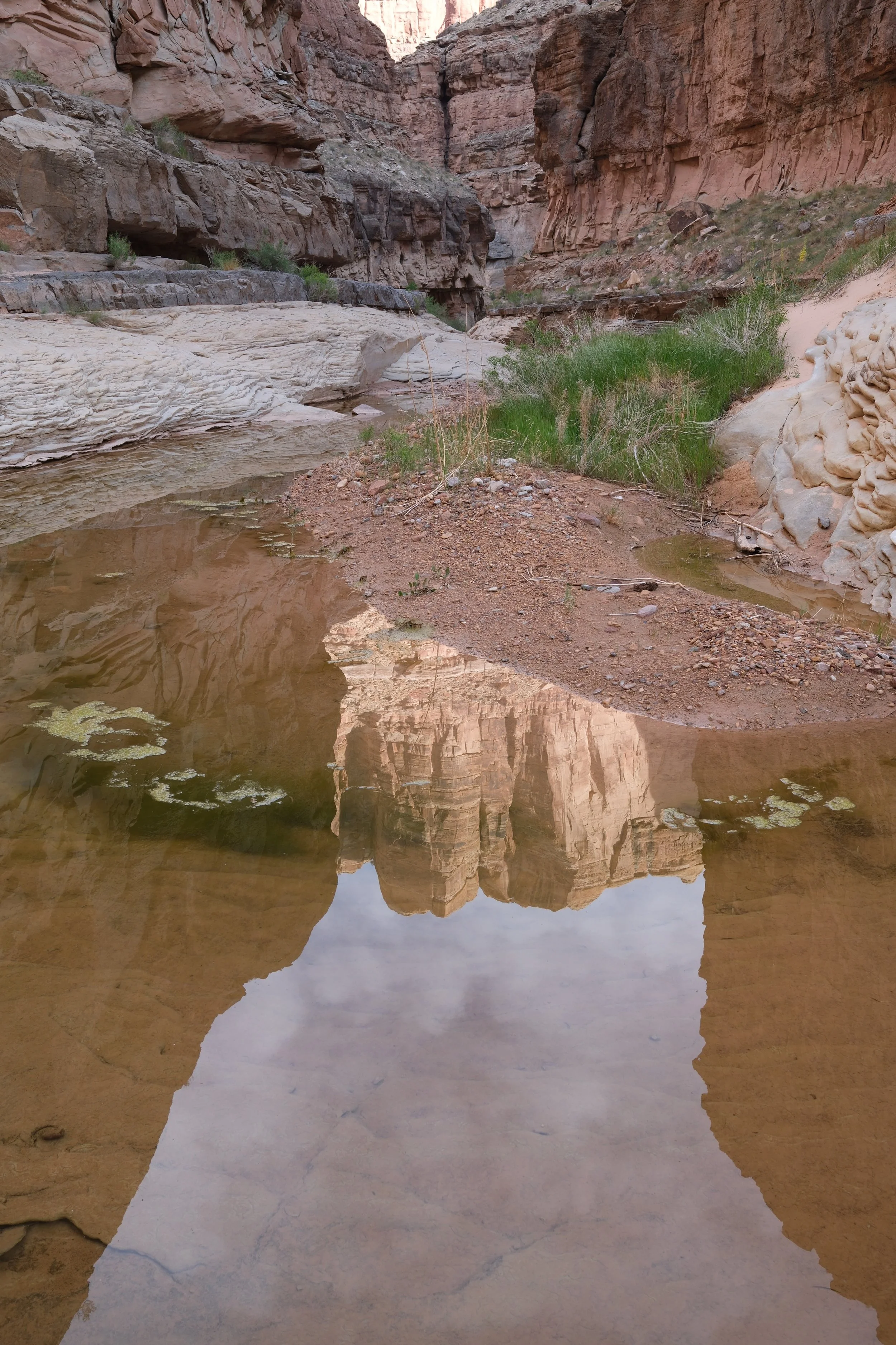 Stone Creek was beautiful. Clear flowing water all the way to the river and a beautiful sandy river basecamp. As well as “Switch-Level” Canyon. Beautiful, clear and tasty flowing water, and now I want to go back just to visit those two and hike up into them. The more you know, the more there is to know. I took the use trail around Blacktail, rather than going down to the river camp. There was river group there and normally I would walk right in but I was antsy to keep hiking and didn’t feel like socializing or explaining what I was doing. Around Fossil were some really wonderful Tapeats sidewalks that dipped right into the river and I found this nice bighorn trail skirting the cliffs around the corner that was narrow but made for easy walking. Going around Explorer’s Monument and looking across to Elves Chasm and the Royal Arch route was also cool. A unique perspective, not seen by many. The Redwall looks so big! I camped way down at a pothole in the big drainage off of Explorer’s Monument because it was the only water I figured I would find before dark and it just seemed like one of those places I may never get back to again. The next day going around Walthenberg and Hakatai felt long and tedious. I didn’t know where the “ramp” was into Hakatai so I went wayyyyy around the whole damn thing. Not to mention the prickly pear might as well be as prevalent as the rocks and boy it was exhausting picking my way through them (and stopping a lot to pry them out of my shoes and feet. Maybe Hakatai deserves another trip too, just for itself, to enjoy it and find the shortcut. But I made good time despite the tedium and camped in a protected overhang off the corner of Fan Island. Weather is coming in and the overhang was so nice and quiet despite the winds around it. This is where desert backpacking often feels so luxurious. Had I been in a tent, I wouldn’t have slept at all due to getting battered all night!